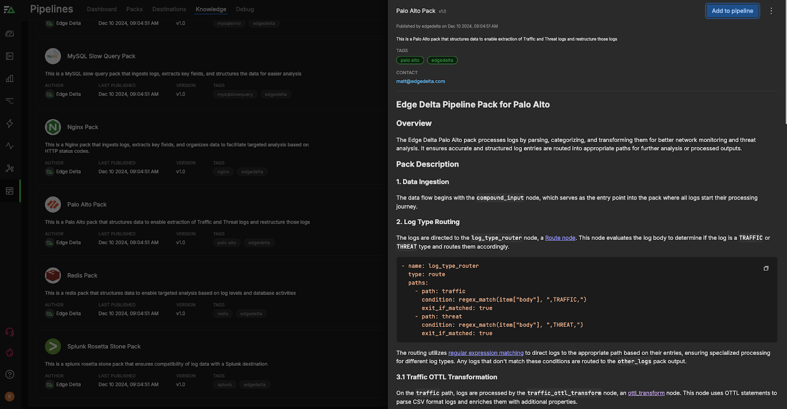 You can find the Palo Alto Pack by heading to the Pipeline section within Edge Delta, and then navigating to “Knowledge,” and then “Packs.” Scroll through our packs, which are organized alphabetically, until you find the Palo Alto Pack. Once you do, click “Add to pipeline” and select the pipeline you’d like to add the pack too. If you don’t already have a pipeline setup, you’ll want to go ahead and create one that’ll use Palo Alto logs as a source.