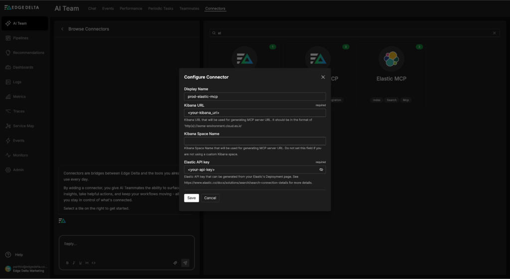With Edge Delta’s extensive Connectors list, AI Teammates can seamlessly access logs, metrics, and traces indexed across multiple systems, eliminating the need to manually switch tools, write bespoke queries, or gather context. With the Elastic MCP Server, Teammates can autonomously pull telemetry data from Elastic, analyze it, and generate insights to guide investigation workflows and accelerate remediation.
