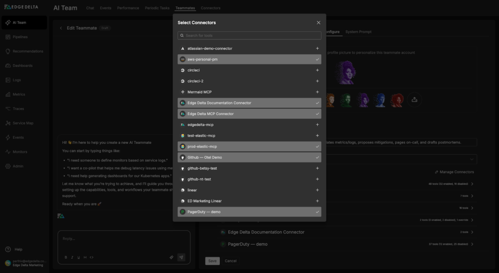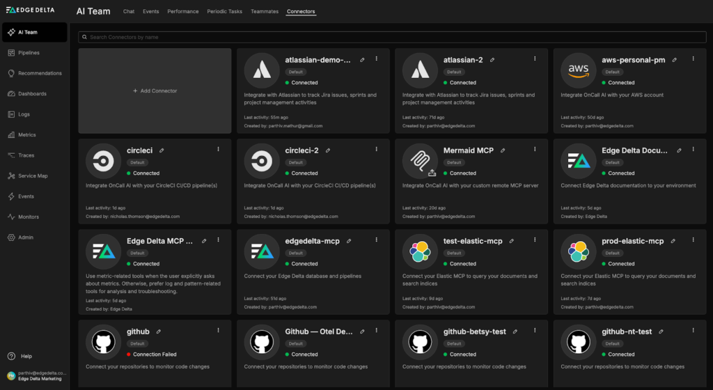 To run real-time workflows effectively, agents need direct access to the systems where data lives. Edge Delta’s extensive connector catalog exposes third-party tools via the Model Context Protocol (MCP) to AI Teammates, enabling them to query, enrich, and act on external data living outside Edge Delta’s Observability Platform as needed.