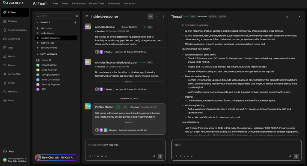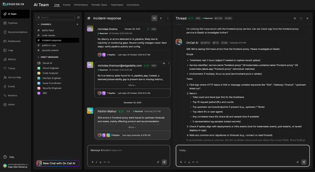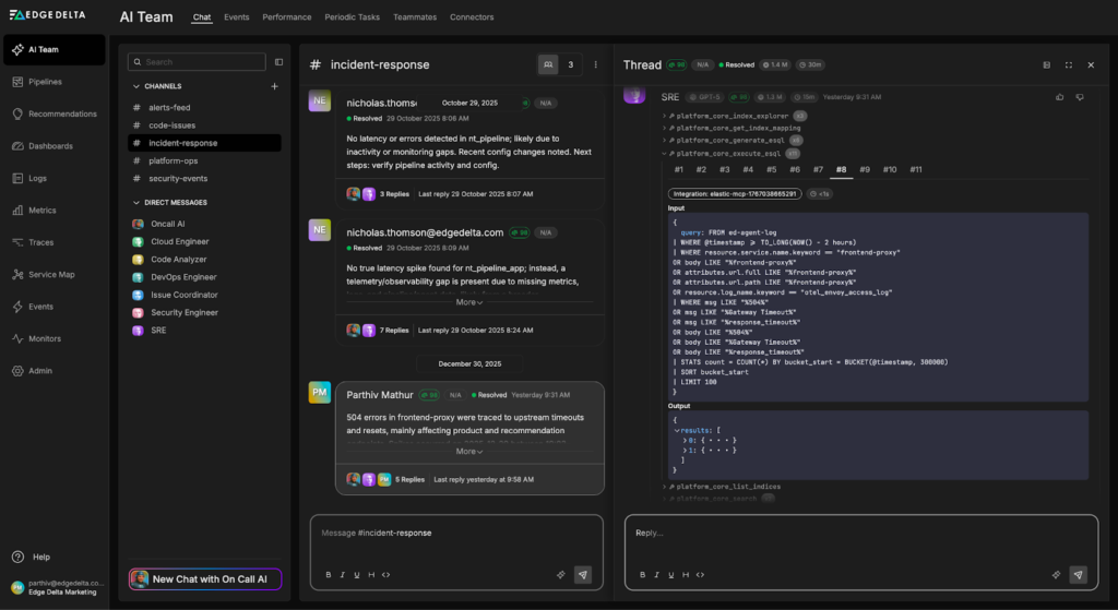 Edge Delta’s AI Teammates are modernizing how observability and security teams investigate and remediate issues. These autonomous AI agents collaborate with each other in real time to analyze live telemetry data, surface anomalies, and initiate fixes, all while sharing their reasoning and actions to keep humans in the loop every step of the way.