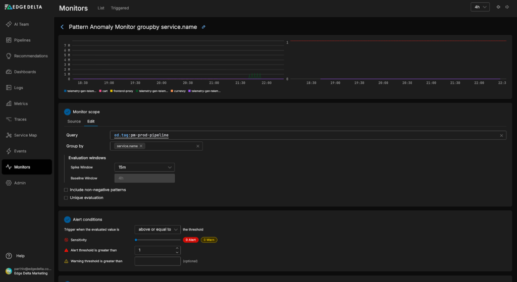 Anomaly detection only delivers real value when it scales with modern systems and produces actionable signals. By applying intelligent upstream patternization, Edge Delta enables teams to run anomaly detection on petabytes of data in order to surface critical issues in real time.