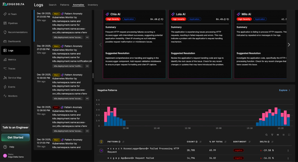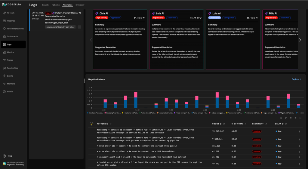 In this post, we’ll walk through this workflow from end to end. You’ll get an up-close look at how Edge Delta detects anomalies at scale, and how AI Teammates help humans investigate and resolve them dramatically faster.