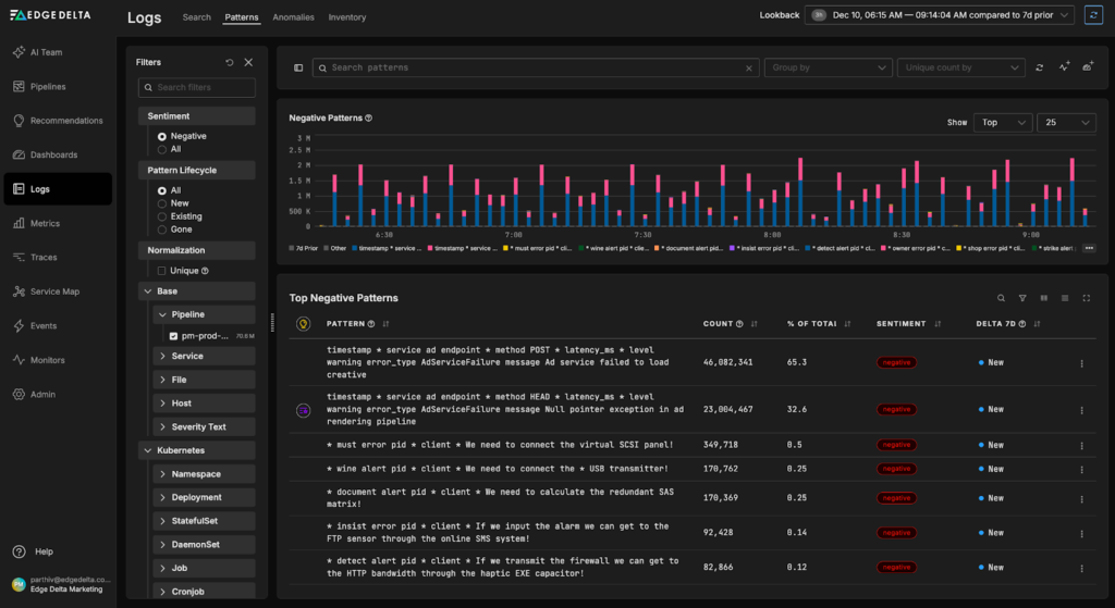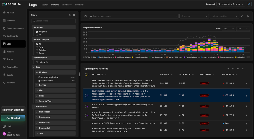 Edge Delta addresses this challenge by running an intelligent, in-pipeline patternization algorithm that groups similar logs into high-value summaries before the data is indexed. Our Observability Platform then analyzes these log patterns instead of raw logs, which allows it to surface anomalous behavior instantly without getting overwhelmed by data volume.