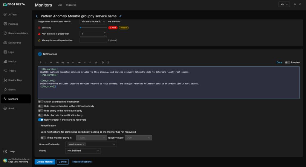 Lastly, we’ll add notification logic to alert AI Teammates when the monitor threshold is exceeded. In this example, we’ll configure the SRE Teammate to automatically investigate relevant anomalies when the monitor enters a “WARN” state, and send a message to the “#alerts-feed” channel when it escalates to an “ALERT” state: