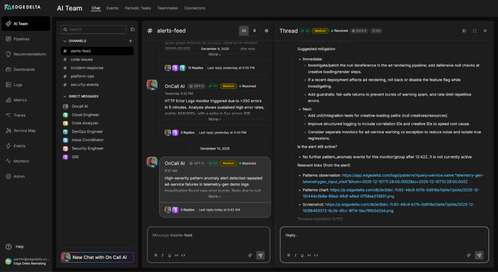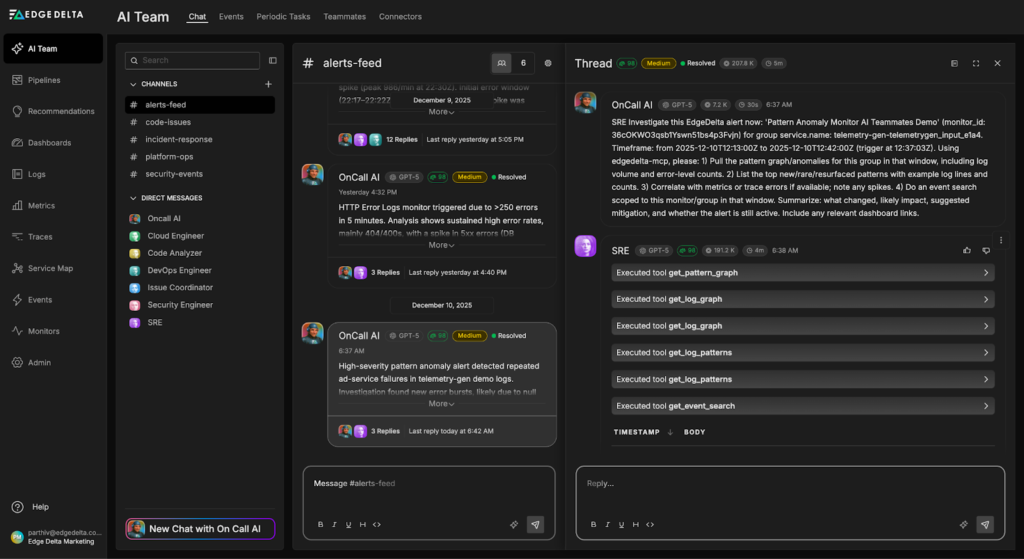 But detection is only the beginning. With Edge Delta’s collaborative AI Teammates, teams can immediately route these anomaly events to a team of specialized AI agents for SRE, DevOps, Security, and more. These agents autonomously investigate, summarize, and kick off remediation workflows, enabling teams to resolve the underlying issue in minutes.