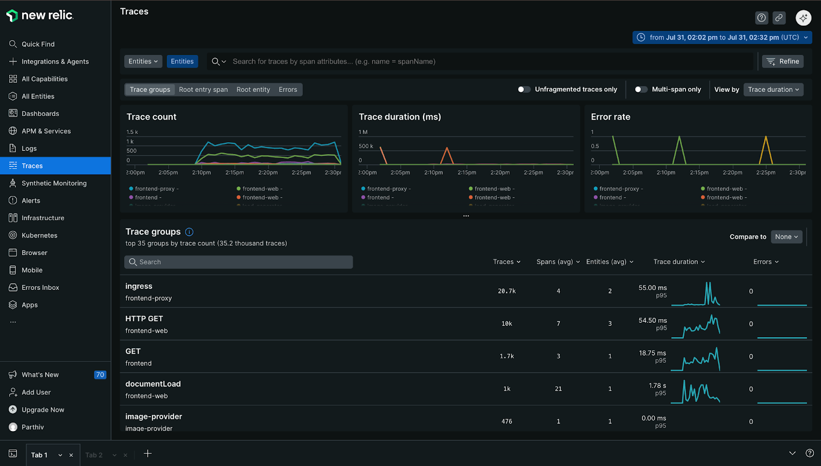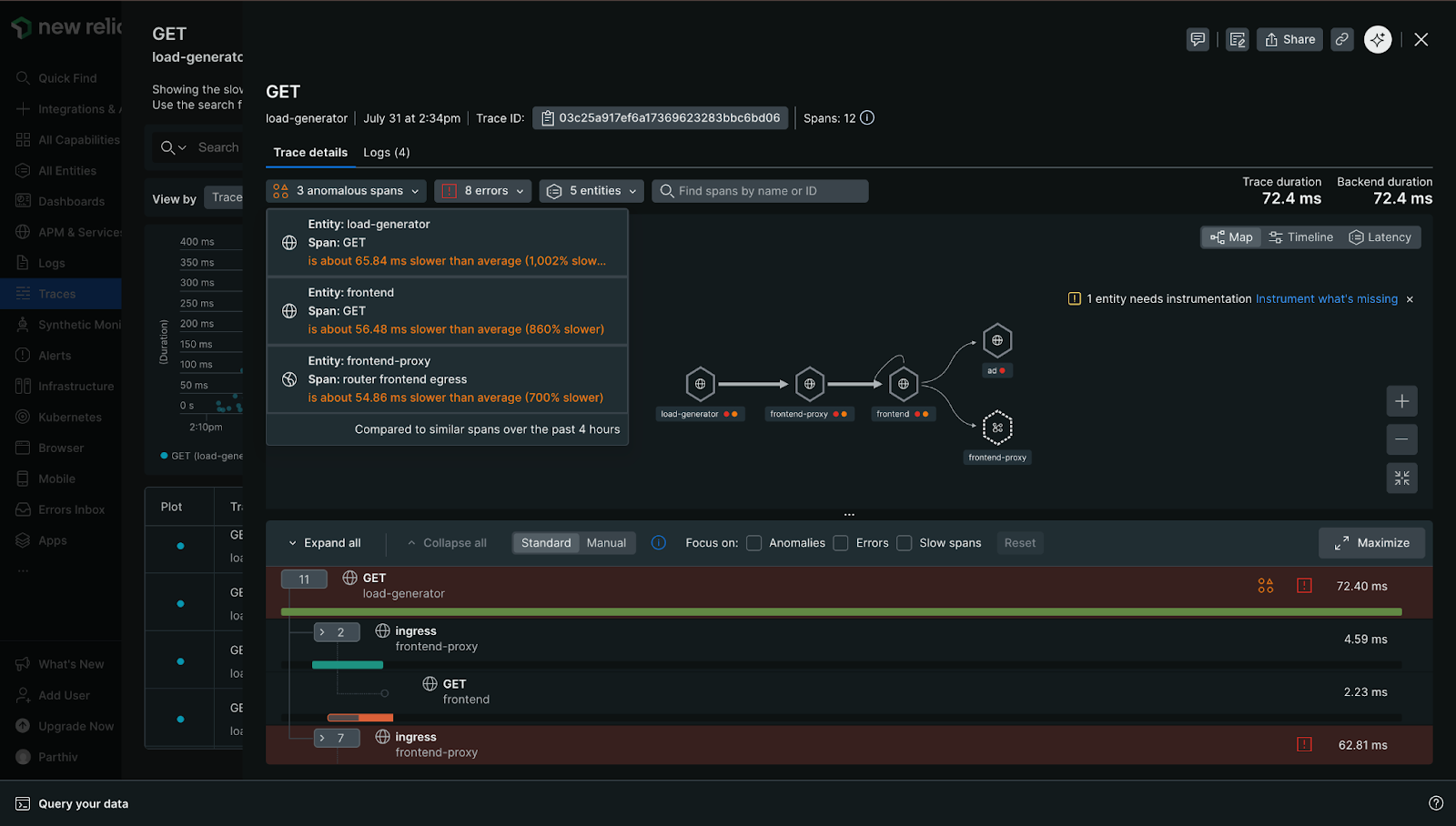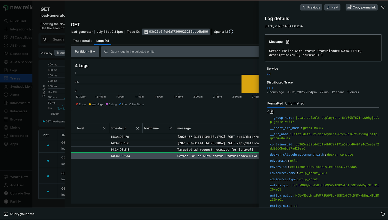 From here, we can explore traces more deeply, leveraging New Relic’s pre-built dashboards and troubleshooting tools to investigate system behavior. For example, we can see in the trace explorer view that a few of our “GET” requests from the “load-generator” service are experiencing some errors:
