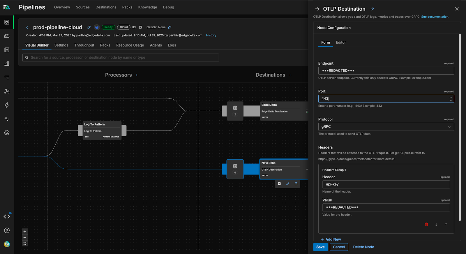 Next, we’ll add an OTLP Destination node to our pipeline, which supports any OTLP-compatible endpoint across a wide range of downstream platforms. In this case, we’ll configure it to send data to New Relic’s OTLP endpoint. To complete the setup, we’ll include an api-key header for authorization and enable TLS (both of which are required for OTLP ingestion by New Relic).