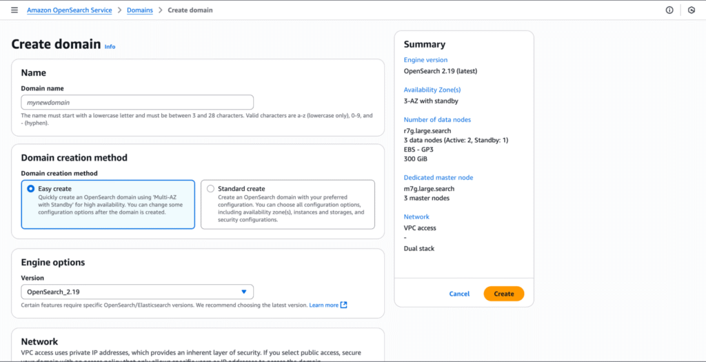 This will open up the “Create domain” page, where we can configure key parameters for our OpenSearch instance, including the master username and password, network type, access policy, and more.
