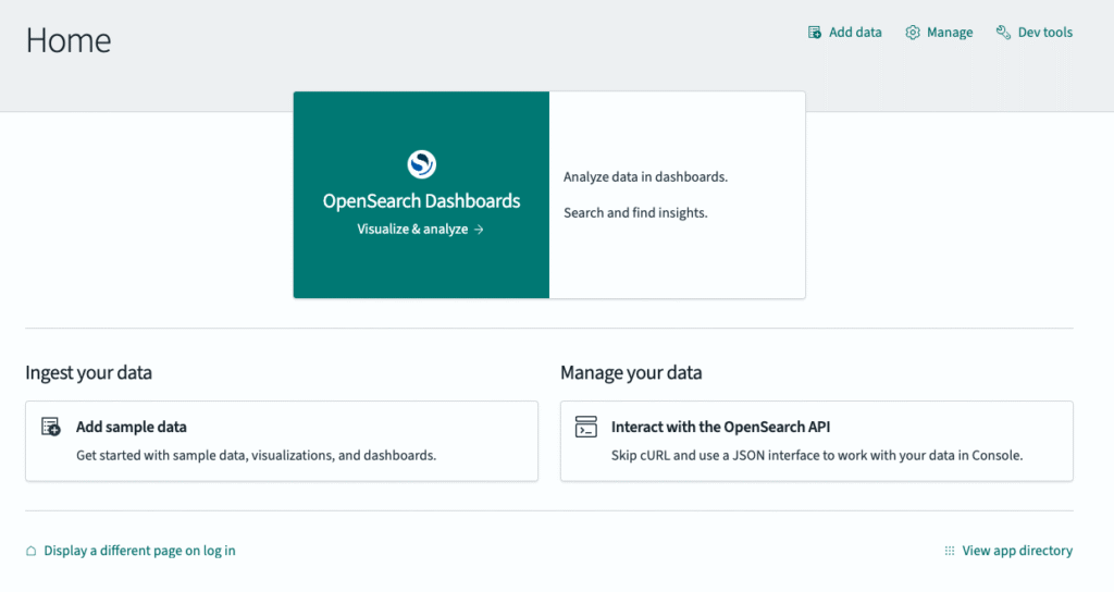 Now, let’s navigate to our OpenSearch instance using the “OpenSearch Dashboards URL” link on this page, and enter the master user credentials to log in to our home page: