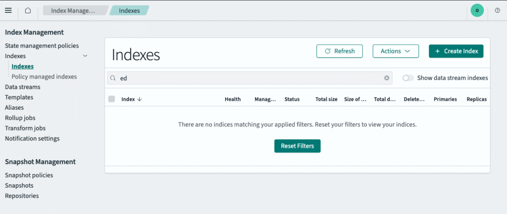 Once we’re in, we need to create indexes to receive data from our pipeline — they are required to query data in OpenSearch (for more details, see the official documentation). To do this, we’ll navigate to the “Management” section of the sidebar, select “Index Management,” and click on “Indexes:”