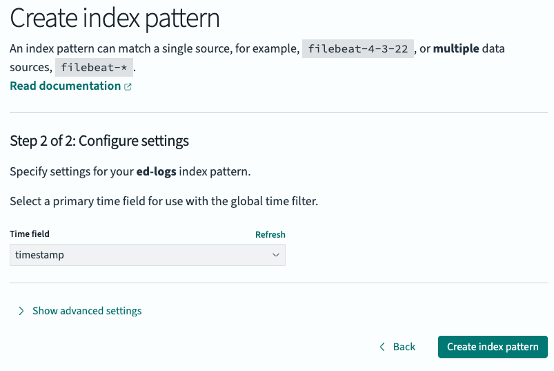 Then, we’ll click on “Next step,” map the time field to the timestamp property we created above, and select “Create index pattern:”