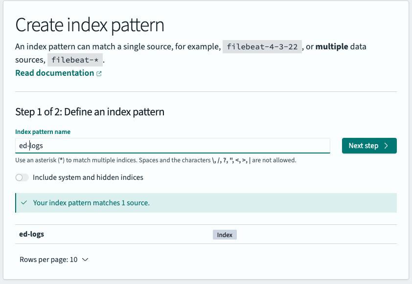 Next, we need to create an index pattern and tie it to our “ed-logs” index, which will inform OpenSearch to include it when we’re performing queries.