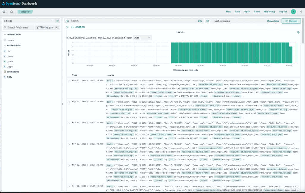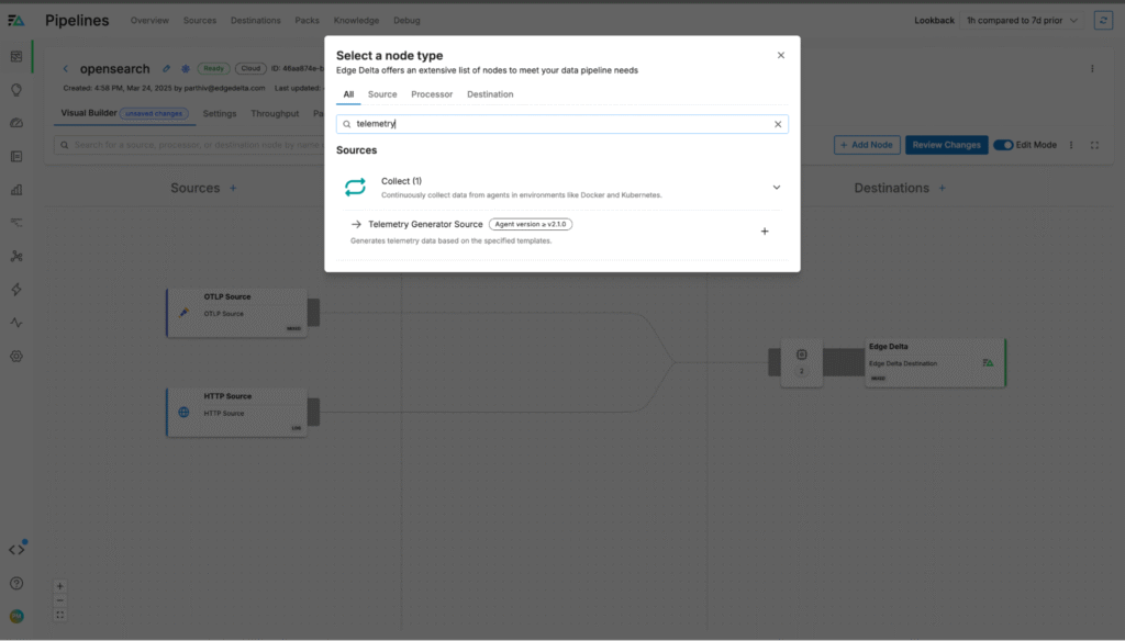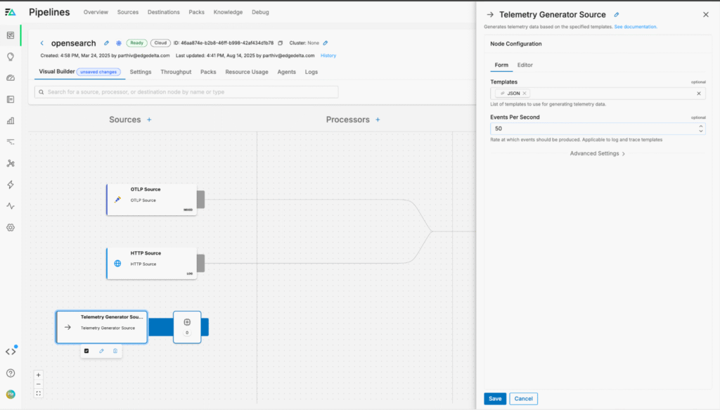 Once our pipeline is deployed, we can start using it to send data into our OpenSearch environment. To do this, we’ll leverage Edge Delta’s built-in TelemetryGenerator source node, which allows us to send synthetic log data through the pipeline with minimal configuration.