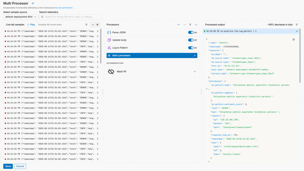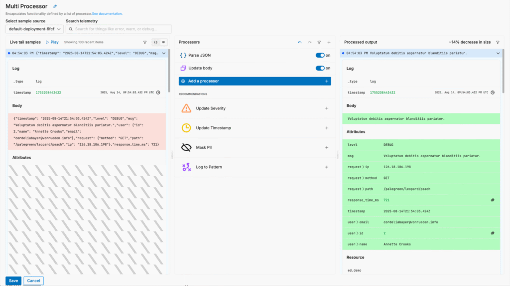 With Edge Delta’s Telemetry Pipelines, we can optimize log data to reduce volume pre-index without sacrificing visibility. For example, we can parse the JSON payload and streamline the “body” field to shrink log size without losing any fidelity: