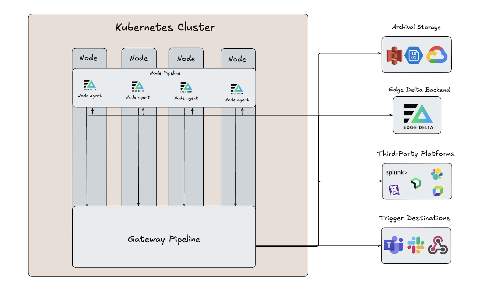 Edge Delta’s Gateway Pipeline is a Kubernetes-native pipeline solution that provides cluster-wide aggregation, filtering, and sampling. Gateway Pipelines deploy as a ReplicaSet in a Kubernetes cluster, and work by ingesting node-level data collected by our Node Pipeline agents. This allows teams to generate cluster-level insights at the Gateway before it reaches downstream platforms, which is critical for monitoring and troubleshooting at scale.