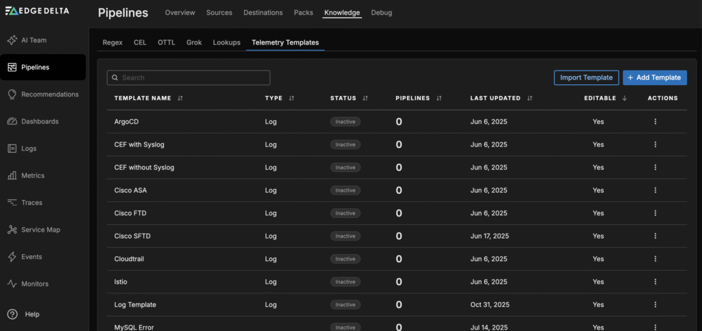 You can access the template creation form by clicking on “Knowledge” from the Pipelines navigation bar, followed by “Telemetry Templates.” There, you’ll see a list of all of the templates that your team has created — as well as a button to add a new one.