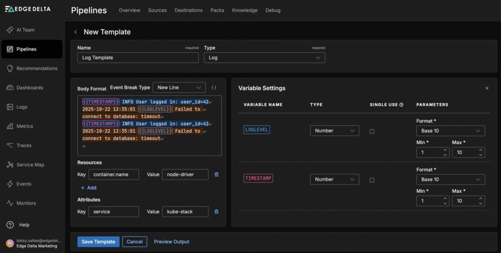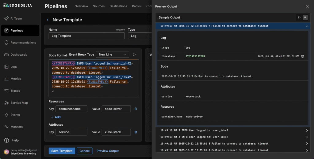 Edge Delta’s Telemetry Generator closes this gap by instantly creating realistic logs, metrics, and traces, enabling teams to test pipelines and validate processors without spending hours configuring mock sources or replaying production events. This synthetic data behaves and looks just like the data your production environment produces every day — complete with timestamps, attributes, and values that help you test how your pipelines respond in real conditions.