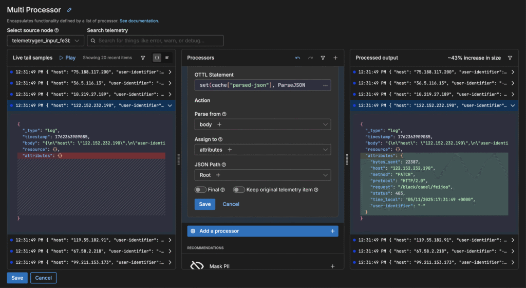 Step 5: Test and Adapt with Live Capture Once your synthetic data is flowing, you can test your configurations and processors using Live Capture and real-time modification, making it easy to adapt test cases on the fly. This allows you to experiment safely, instantly observe the impact of each change, and fine-tune your setup for a cleaner, more reliable telemetry pipeline.
