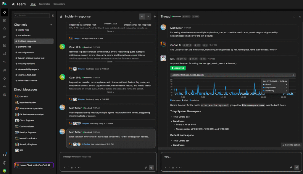 - Faster Incident Response: Whether it’s a failed deployment, a bug in production, or a sudden spike in errors, your AI Teammates are already on the case. They will detect anomalies or failure patterns in seconds, and initiate an investigation thread among themselves. And by the time you get an alert, it comes with rich context — the likely root cause, impacted services, and recommended actions — assembled collaboratively by specialized agents. This turns “panic moments” into more manageable problems. Teams can address incidents faster, reducing downtime and user impact dramatically.