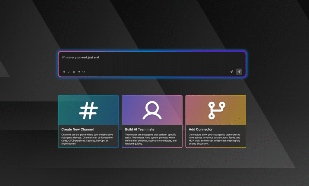 AI Teammates are a network of specialized AI agents that can ingest and analyze data streams in real time, collaborate with each other, and interact with your team. Unlike a single chatbot or alerting script, these agents have different areas of expertise (for example: deployment monitoring, performance anomalies, security threats, etc.) and they communicate among themselves and with you. Their mission is to surface the right insights at the right moment and even coordinate next steps, so that you and your team can respond with speed and precision in critical situations.
