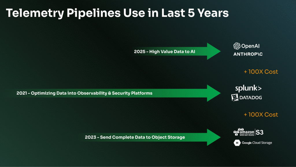 This idea led to a third major use case for our telemetry pipelines: feeding intelligent AI workflows. We realized our pipelines could serve as the secure, scalable highways that connect live enterprise data to AI in a safe and controlled way. This would allow AI not just to analyze static datasets or chat about general knowledge, but to plug into live systems, watch events as they happen, and take initiative (under human guidance). In other words, it enables AI that’s not just in the loop, but for the loop, actively helping the humans it serves.
