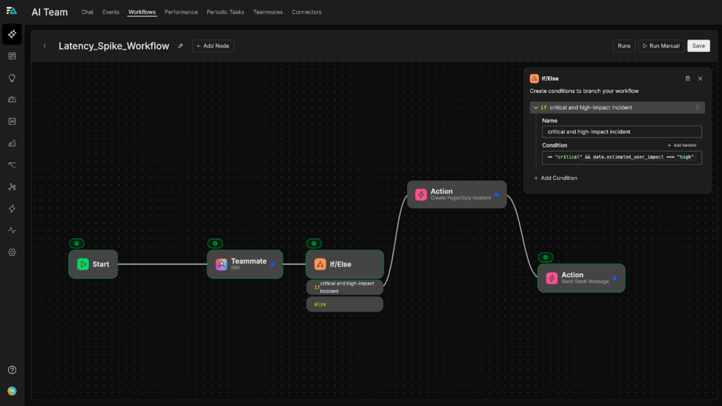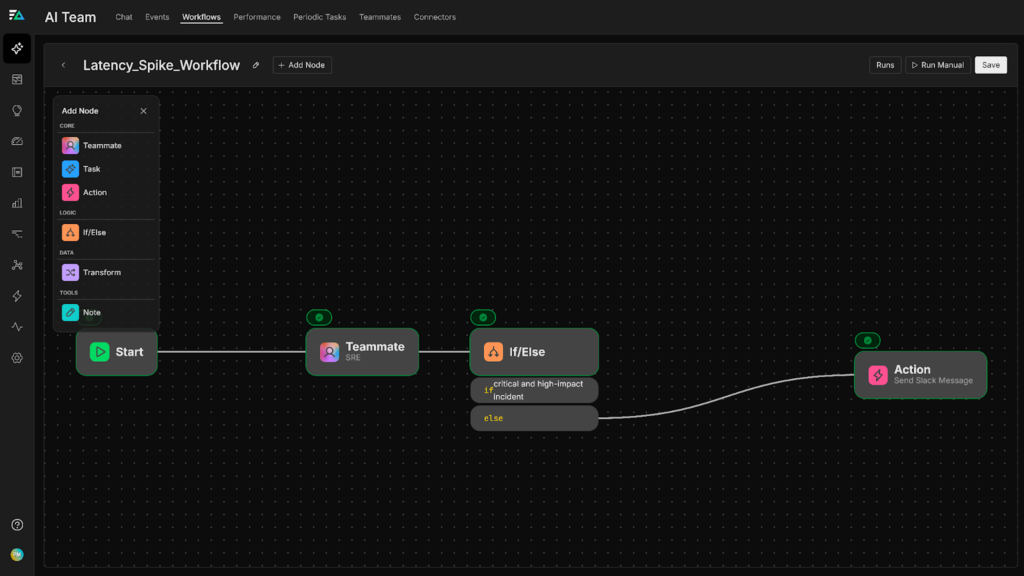 Additionally, handlebars templating lets you reference any upstream node’s output in any downstream configuration. For example, pulling {{nodes.investigate.root_cause_hypothesis}} directly into your Slack message template surfaces the Teammate’s structured root cause hypothesis findings exactly where your team needs them.