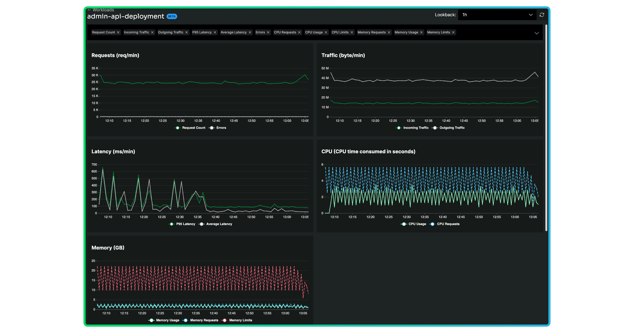 You can drill in further by clicking into the workload. From here, you can explore the golden signals and relevant log data – based on the look-back period and any additional query parameters – associated with the workload.