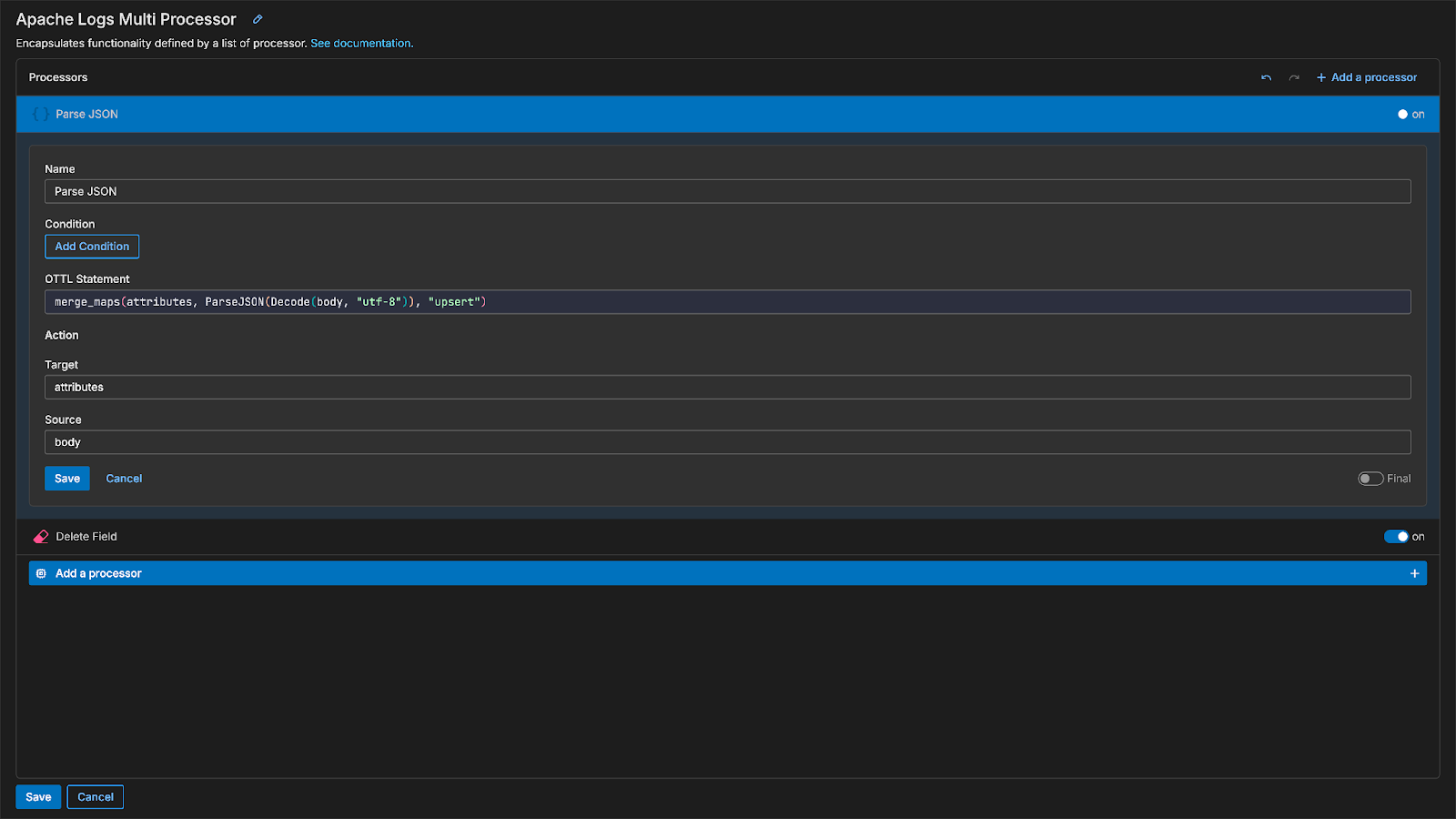 Configuring individual processors within a Multi-Processor Node is straightforward — simply choose the processors you’d like to include, specify which field(s) in the data item you’d like to modify, and Edge Delta will automatically construct the appropriate logic: