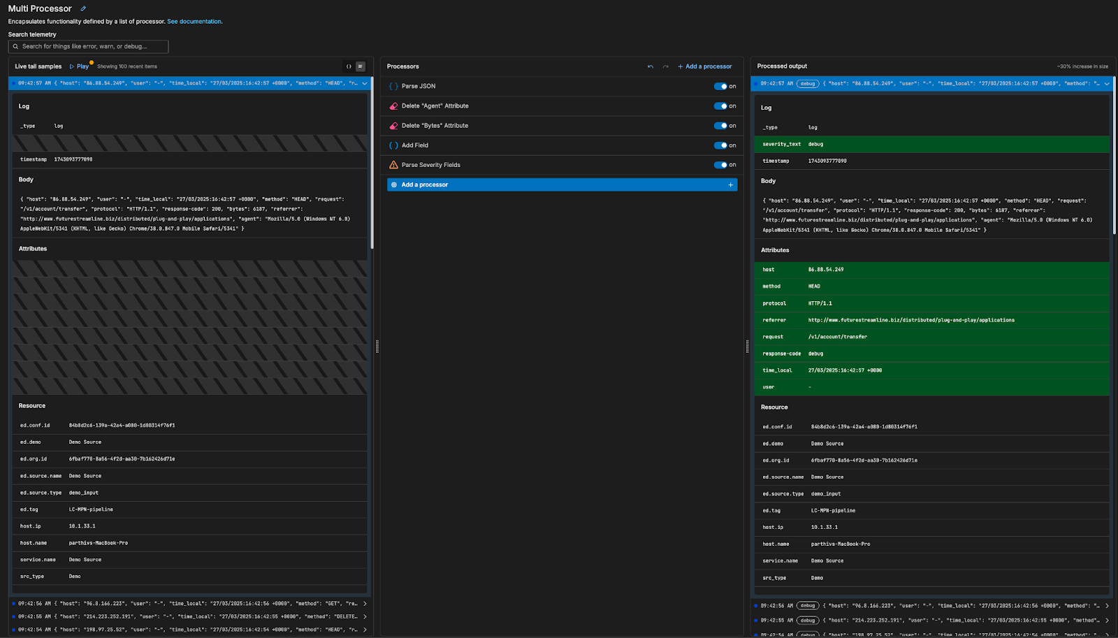 By integrating Live Capture into Multi-Processor Node configuration workflows, Edge Delta users gain a strong collective understanding of how their processors are working in harmony. Within this combined view, users can add new individual processors to their Multi-Processor Node and immediately visualize how they’re modifying the live data flowing through it: