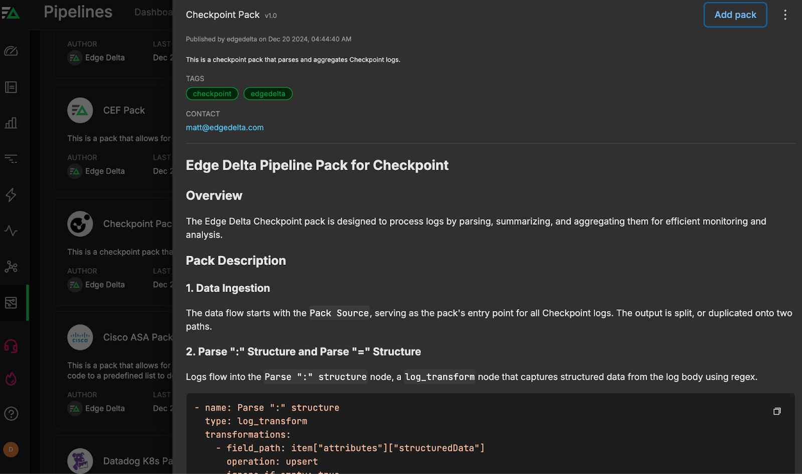 You can find the Check Point Pack by navigating to the Pipelines section within Edge Delta, and then clicking on “Knowledge,” and then “Packs.” Then, scroll through our list of packs — which are organized alphabetically — until you find the Check Point Pack. Once you do, click “Add to pipeline” and select the pipeline you’d like to install the pack on. If you don’t already have a pipeline setup, you’ll need to create one first.