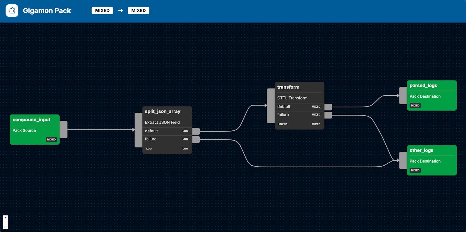 The pack begins by using an Edge Delta Extract JSON Field node to extract all root elements from each JSON-formatted log and properly structure the new log item being created. All logs that fail this extraction step are segmented from the rest, and are then routed through a separate pack output.