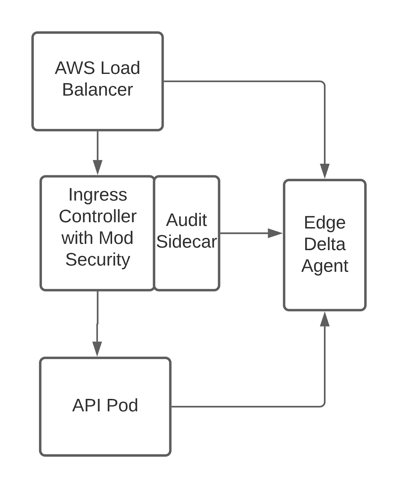 This is a scenario where Edge Delta’s differentiated, flexible deployment model provides value through distributed queries, federated machine learning, and edge computing. In the above case, the Edge Delta deployment was extremely simple. An AWS Load Balancer distributes traffic to multiple ingress controllers in different Availability Zones, running on Kubernetes. The ingress controller checks the traffic with a ModSecurity module and distributes it to API service pods. If the module detects suspicious activity, it creates an audit dump and audit sidecar exports (like the summarized and redacted sample given above) to standard output.