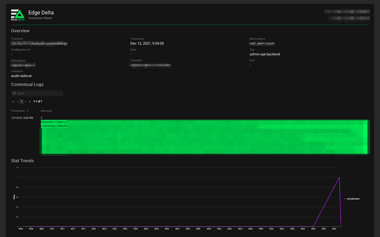 At this time, the internal Edge Delta monitoring platform generated a finding report based on automated statistical patterns and findings correlated from various logs and Web Application Firewall (WAF) events. All of our backend and frontend servers are monitored by multiple WAF solutions, running a slightly customized OWASP ModSecurity Core Rule Set to protect against different web threats. Logs of these systems and many other various sources were analyzed by Edge Delta.