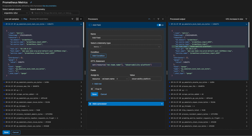 In this scenario, we need to tag the metrics with the correct team in order to clarify who’s responsible for monitoring them downstream. Using Edge Delta Live Capture, we can swiftly build OTTL enrichment logic to assign these metrics to the observability platform team: