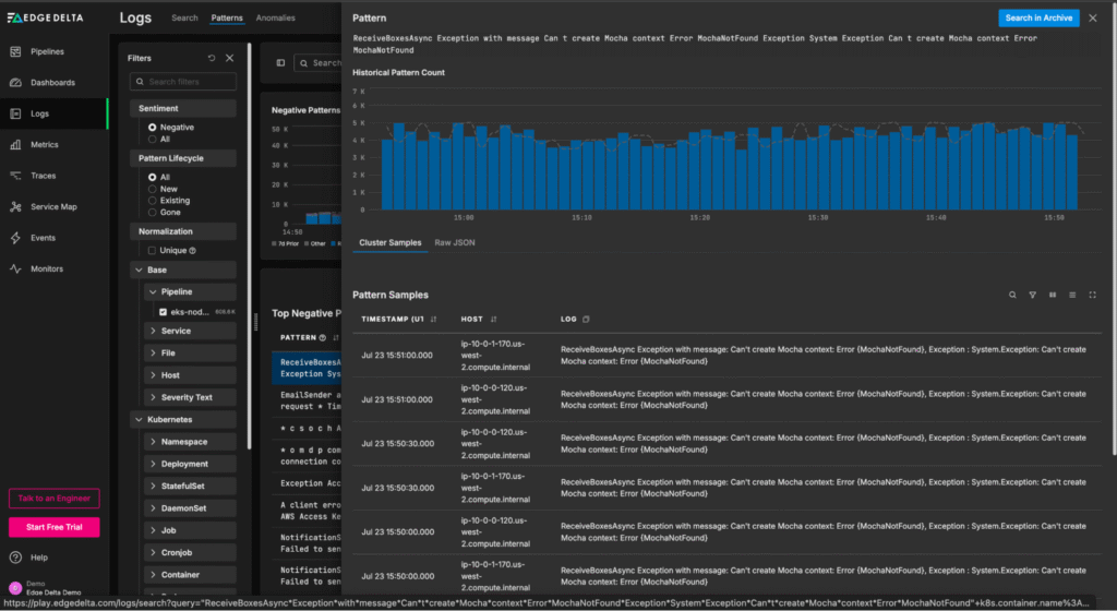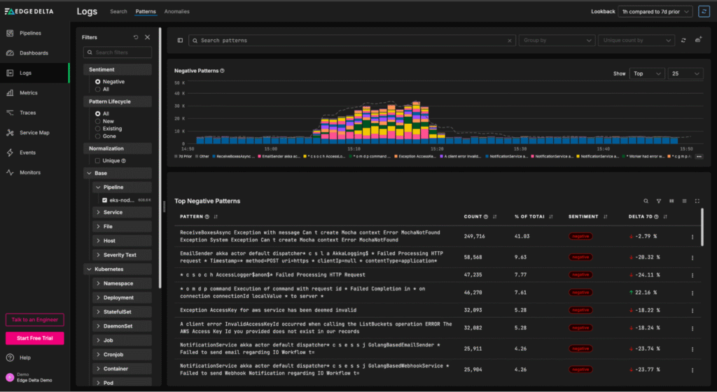 Once created, patterns can be sent to any downstream destination. This includes Edge Delta’s Observability Platform, which provides an out-of-the-box view into pattern behavioral trends: