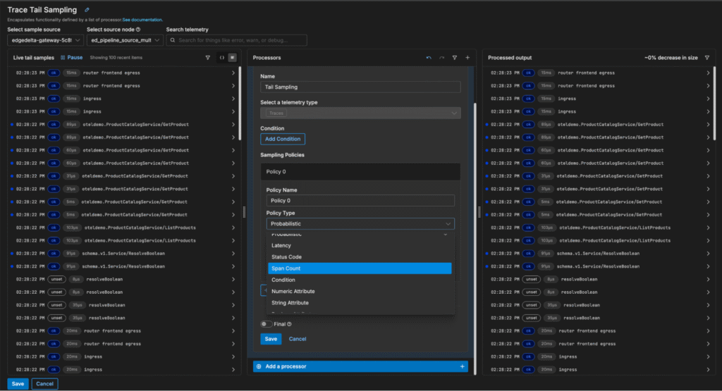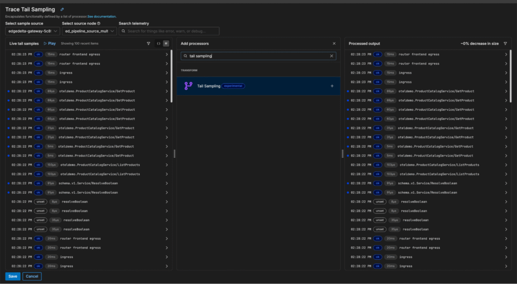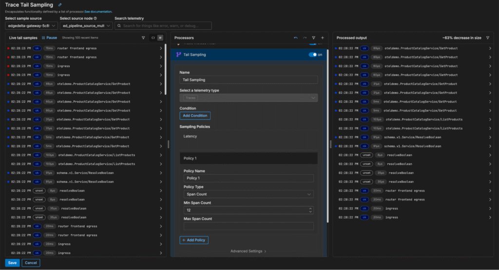 With Edge Delta’s Gateway Pipeline deployment, teams can apply tail-based sampling to filter out low-value traces before they’re shipped downstream, reducing ingestion costs and eliminating noise during troubleshooting.