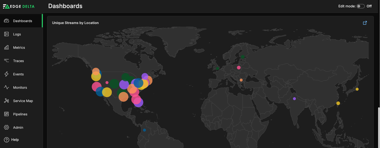 You can also route the data straight into Edge Delta. For instance, once the CMCD metrics have been extracted, they can be fed into Edge Delta for deeper analysis. In this case, you can create a custom dashboard using streaming encoded bitrate metric data to visualize bitrates by region: