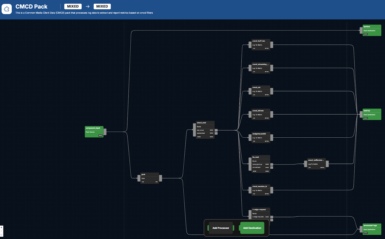 Edge Delta’s Pipeline Packs are pre-built collections of processing steps optimized specifically for popular telemetry data types and formats, including CMCD. With Edge Delta’s CMCD Pipeline Pack, log data is automatically standardized and processed as it travels through Telemetry Pipelines. The pack also extracts key metrics based on CMCD parameters, which power downstream analysis and dashboard visualizations.