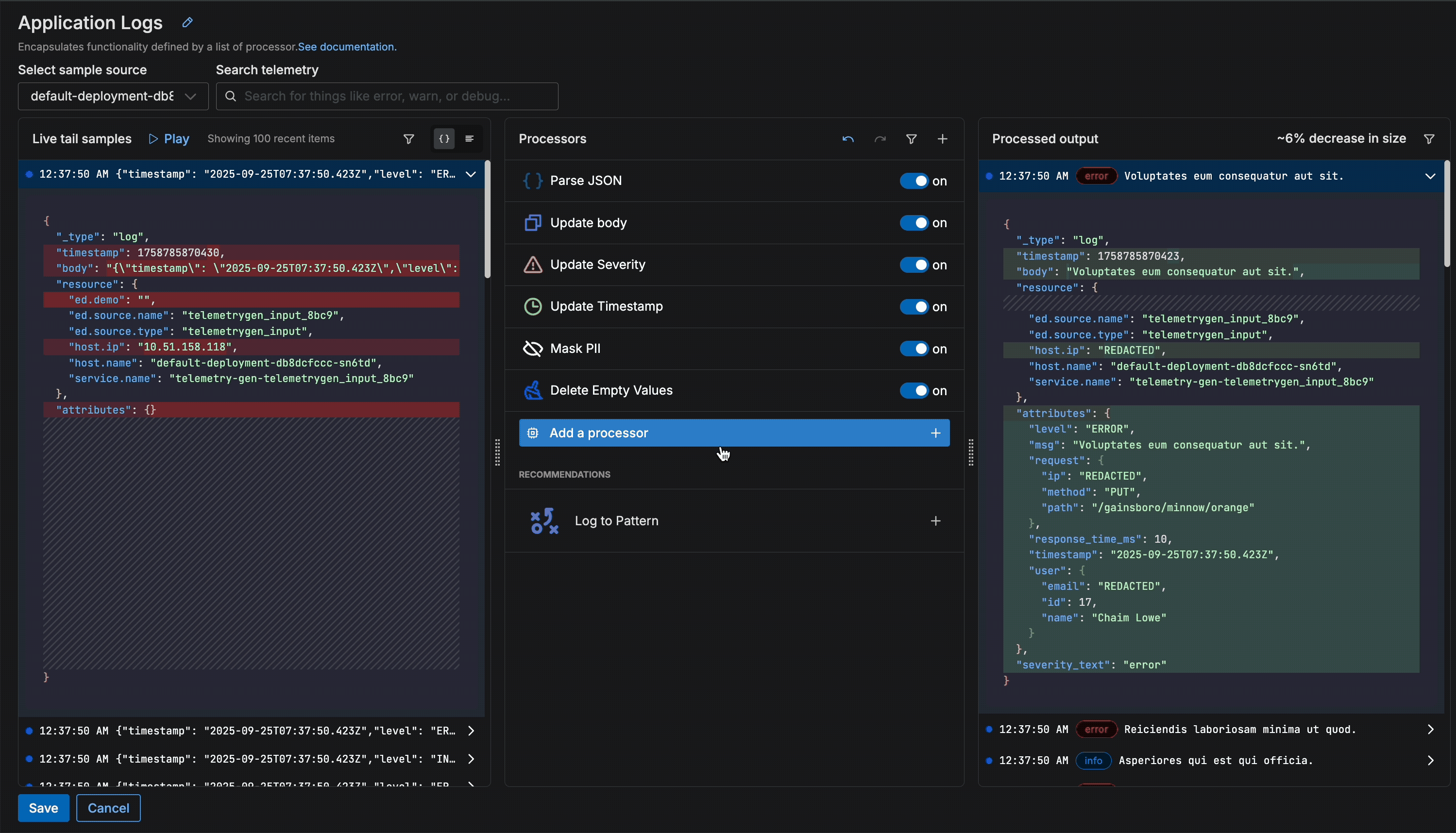 Once logs begin flowing, the pipeline automatically detects a few issues — more specifically, that the JSON isn’t parsed and contains PII — and generates two processor suggestions to solve them: