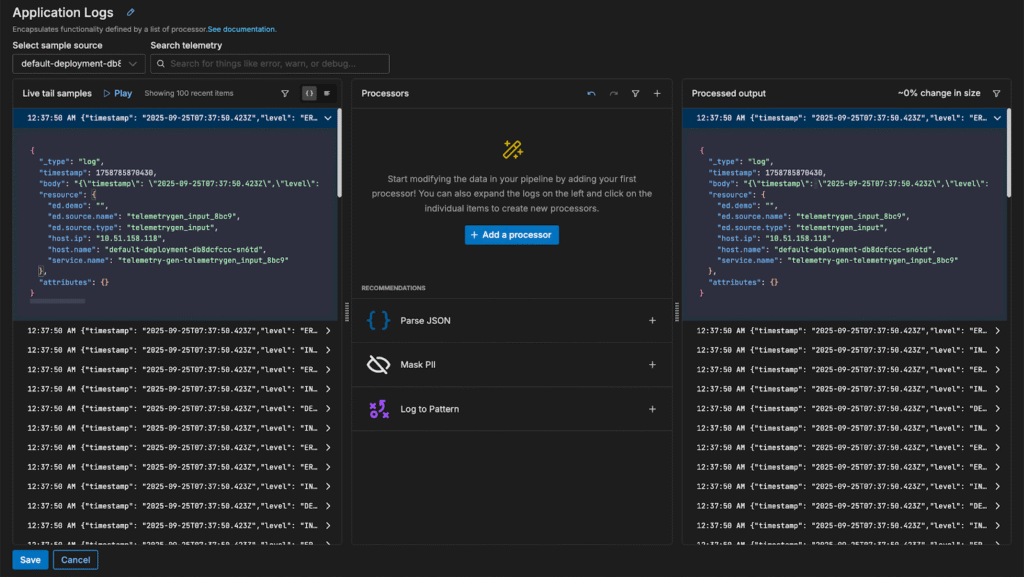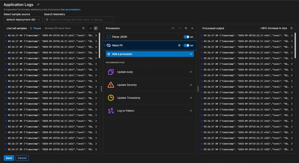 Once the logs are parsed and the fields are structured, the pipeline identifies additional processing recommendations for further optimization: