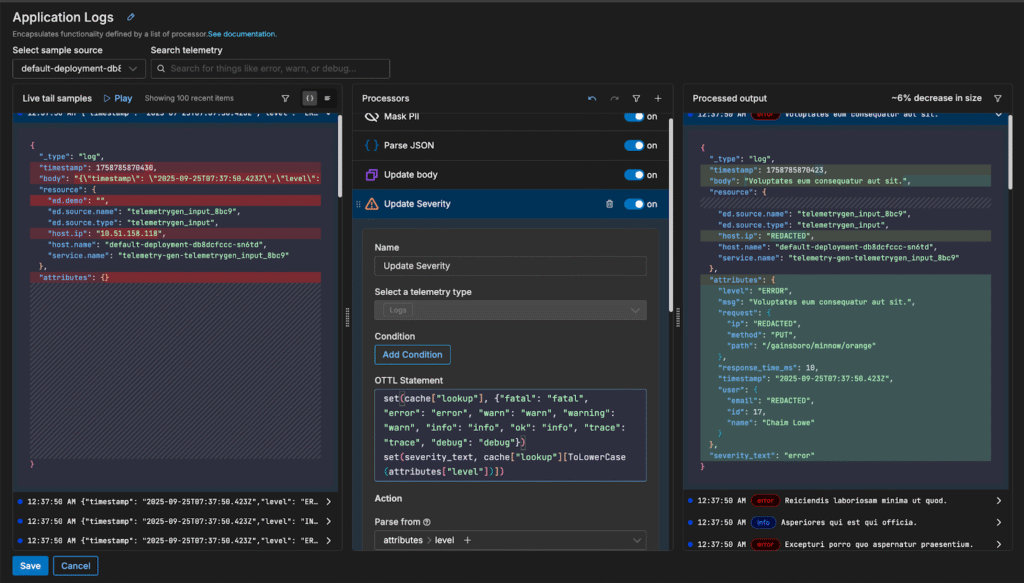 Each of these processors uses OTTL under the hood to perform the operations. For example, the “Update Severity” processor is configured with the following OTTL statement: