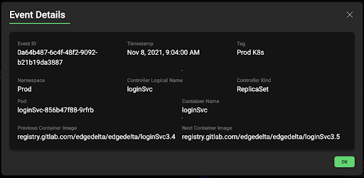 As we drill into the details of this particular change we know exactly what component(s) are impacted. In our case, a new image was deployed for the login service.