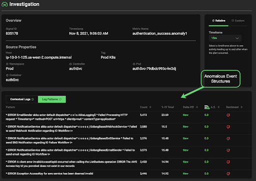 While multiple anomalies are a result of this change (many components rely on the login service), we can isolate just those originating from the pods where our login service runs. In particular, one of our SRE team’s golden signals for the entire authentication workload is authentication failures. Edge Delta constantly analyzes your organization’s KPIs for anomalies and uses a confidence algorithm to indicate how far out of normal a particular signal really is. This feature, Anomaly Score, uses machine learning to automatically eliminate noise from frequently occurring patterns.