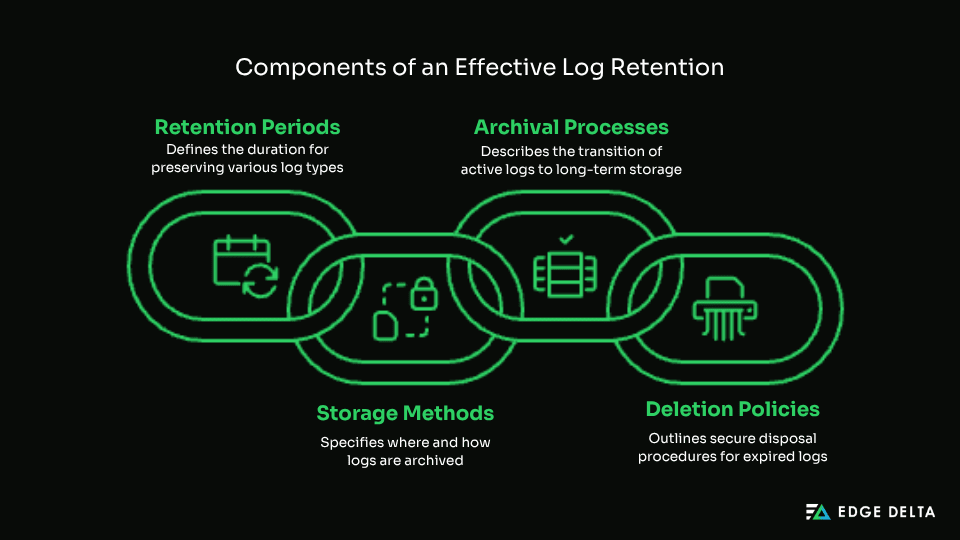 - Archival processes: Transitioning active logs to long-term storage