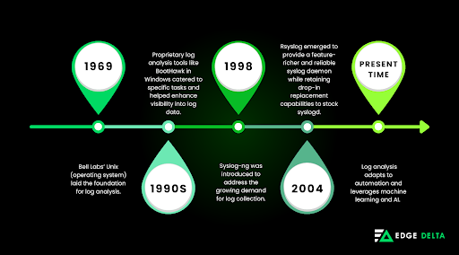- 1969: Bell Labs’ Unix laid down the foundation for log analysis. The operating system didn’t have the tools to aggregate log files then, so admins relied on essential text manipulation tools to understand the log file. The admins can only do log analysis on an as-needed basis.