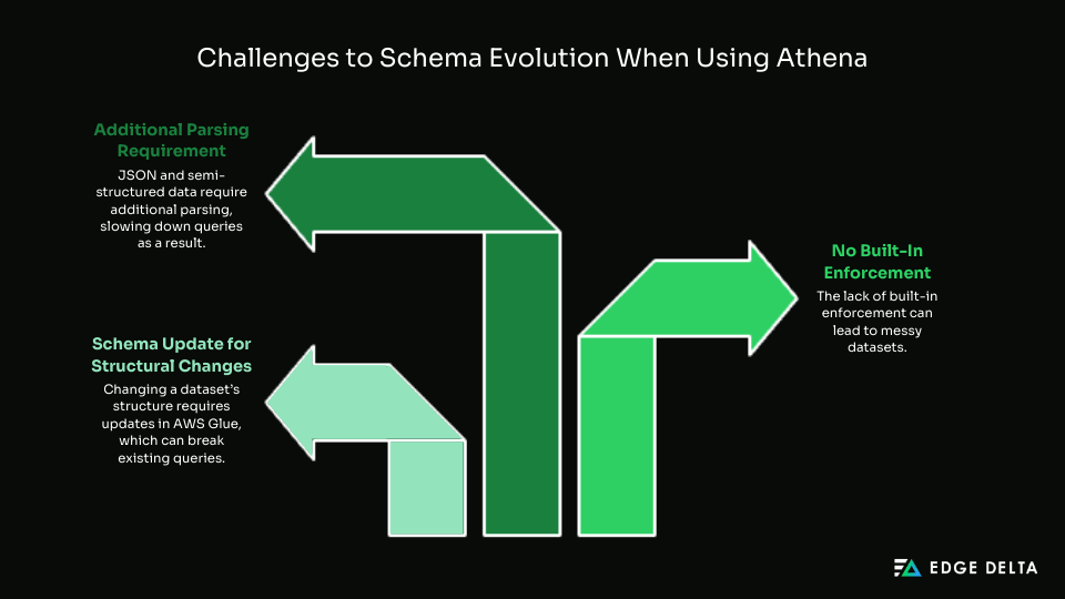 Since Athena follows a schema-on-read approach, you don’t define a rigid schema beforehand. However, this flexibility comes with challenges:
