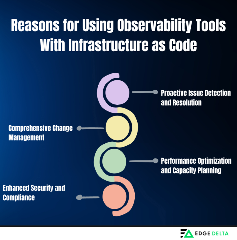 - Most companies use observability tools with infrastructure as code for a number of reasons, including issue detection and resolution, comprehensive change management, performance optimization, and capacity planning.