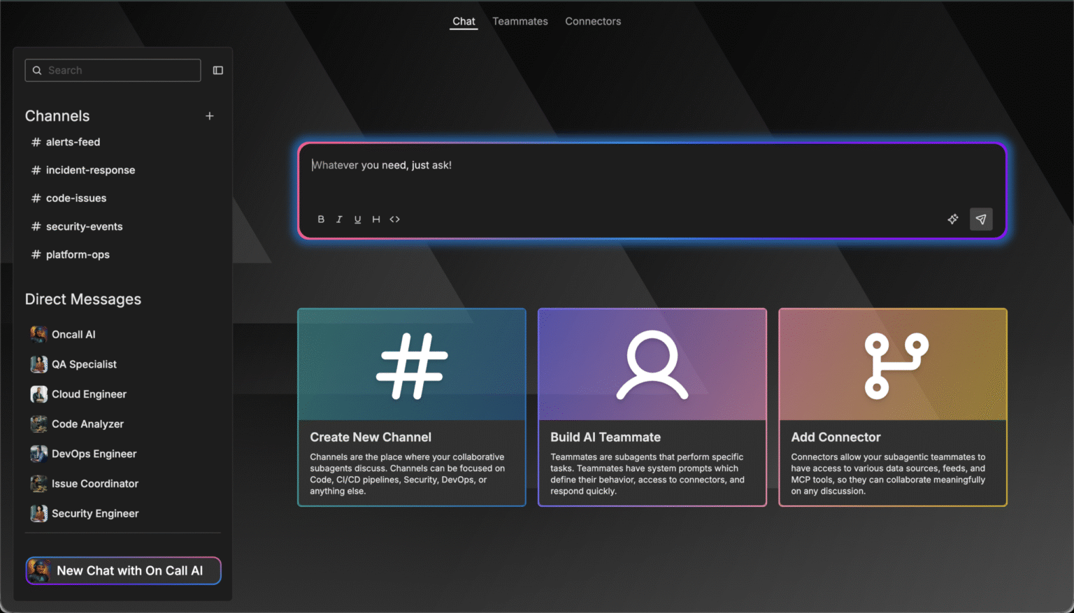 Create custom Teammates by chatting with OnCall AI. Simply describe what you want the Teammate to do, add it to channels, and fine-tune the prompt as needed.