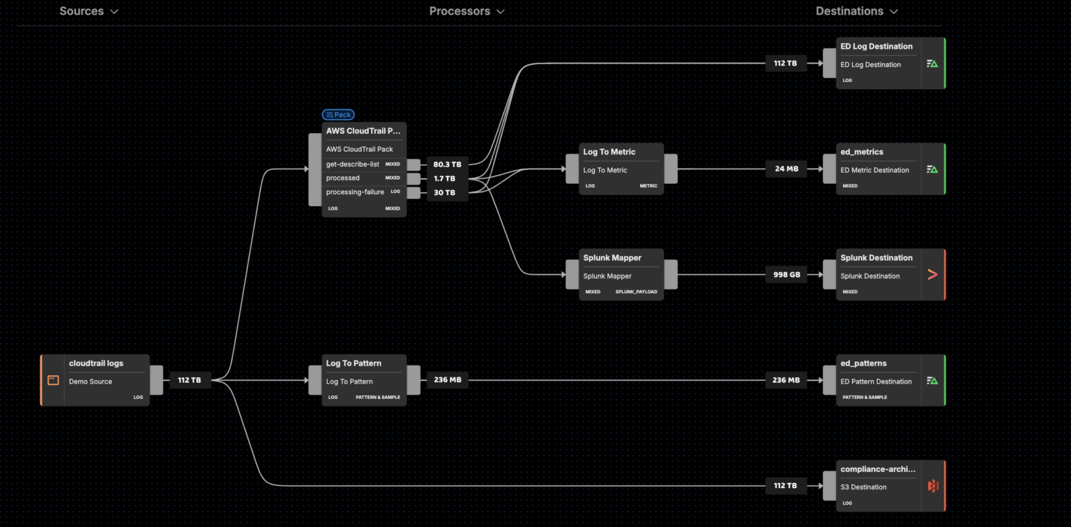 Edge Delta processes your log data as it’s created, and our Visual Pipeline interface lets you easily route it to any number of downstream destinations, including other monitoring platforms and cold storage.